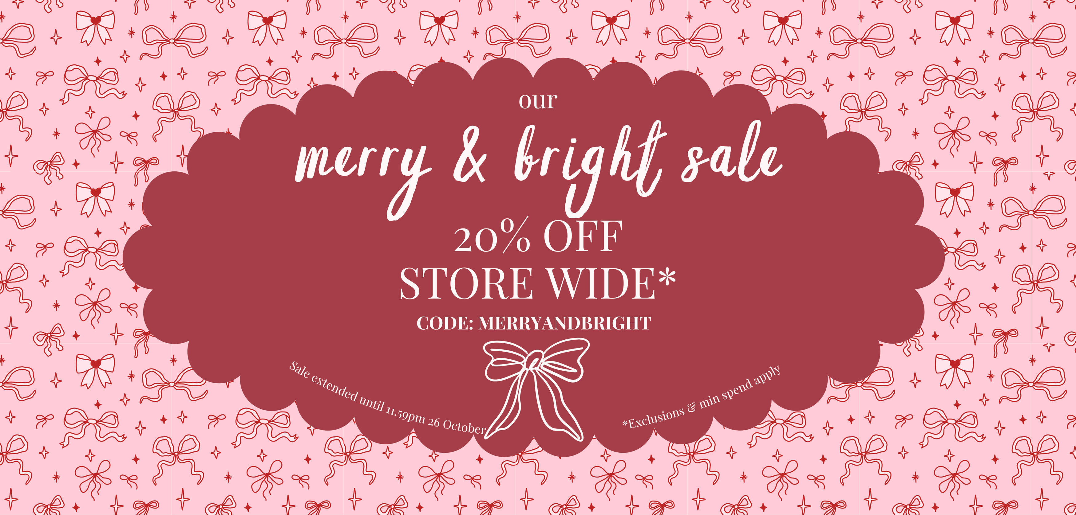 OUR MERRY & BRIGHT SALE IS NOW ON! SAVE A HUGE 20% OFF STORE WIDE* WITH CODE "MERRYANDBRIGHT" (Exclusions and $50.00 min spend apply. Ends 11.59pm 26/10/25)