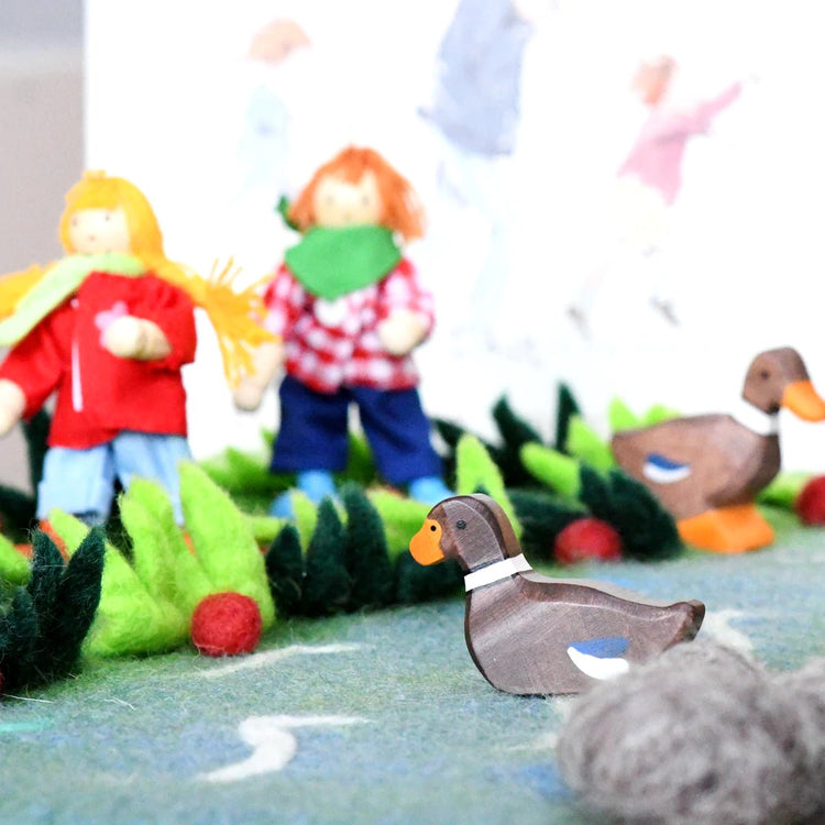 Create the perfect backdrop to an invitation to play, Tara Treasures felt playscapes work well with the full-sized animal figurines (from Schleich, Collecta or Safari Ltd etc) and wooden toys. At a length of 80cm, this Bear Hunt playscape is large enough for a full tabletop or it can be used as a floor mat. Once playing is done, the mat can be rolled up and fastened with a button for easy storage (as illustrated in the image).