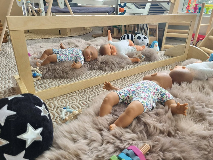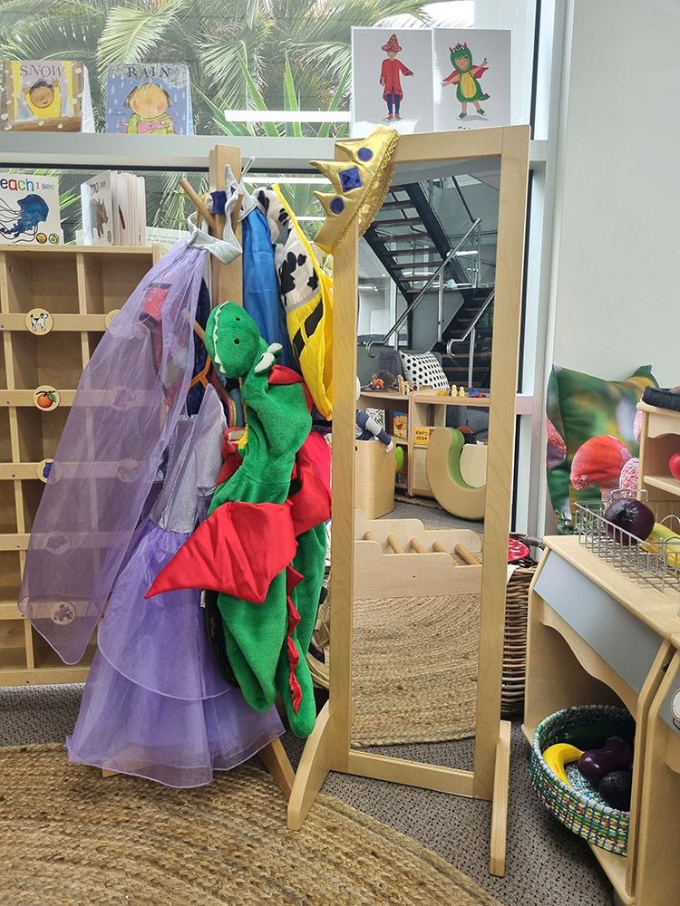 Free standing and shatter proof Birch plywood mirror, can be used as a cheval dress up mirror and also as a low toddler mirror. Perfect for children to dress up in front of and also capture toddlers' interests.