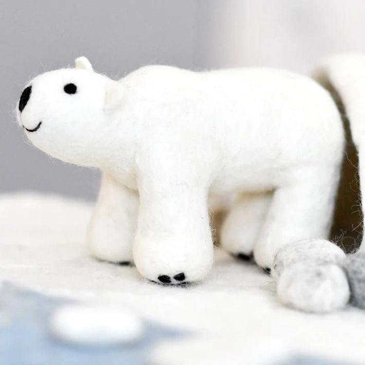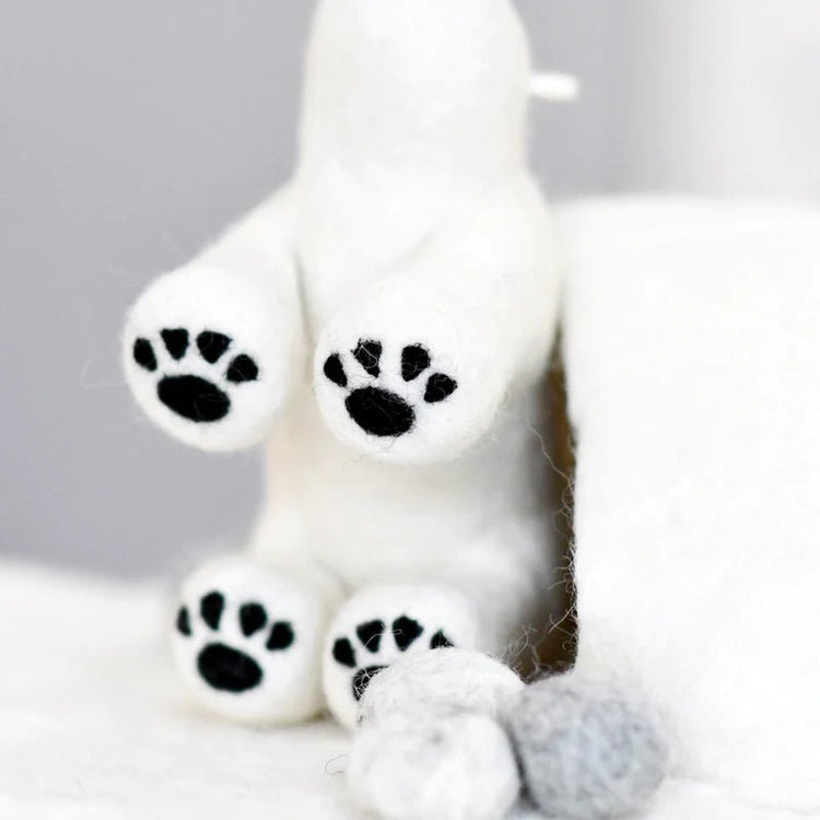 Adopt this adorable felt polar bear toy, which fits into the cave of the Large Arctic Playmat by Tara Treasures. Check out the the paws under the feet of the polar bear!
