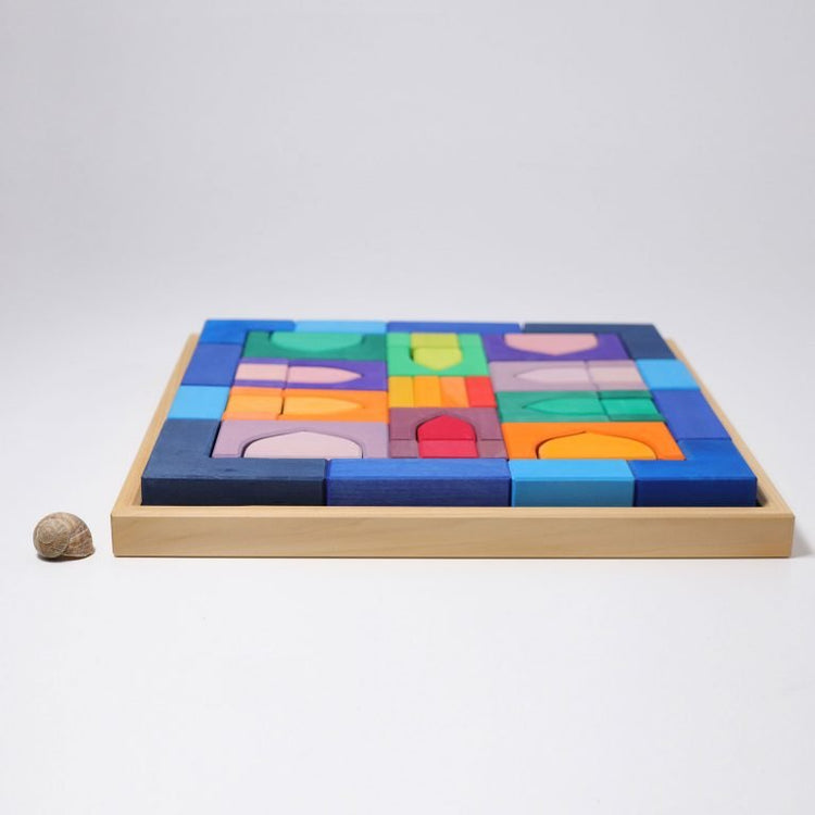 The Grimm’s 1001 Nights wooden block set is a substantial set and comes in a solid wooden tray, making it a magical puzzle too! This set contains straights, L shapes, arches and doors for building homes, towns, castles…your imagination is the only limit! Experience the magical world of 1001 nights! Even younger children will be fascinated by the intense colours and beautifully formed elements. Create more mystery and wonder with this building set when combined with glass stones, silk scarves, dolls and other elements.