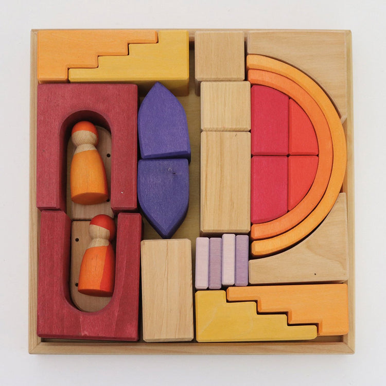 Rich yellow, orange and red tones mixed with natural wood give the desert sand a deep warmth. The building materials in a wide variety of forms enable imaginative free building and complement the GRIMM’S range with their loving details, such as special robes of the two friends and a mountable, movable door.
