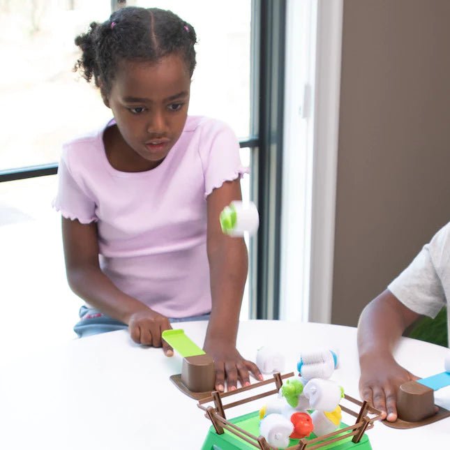 Game of catapulting sheep to stick them to a hook-and-loop paddockEncourages fine motor skills, coordination, concentrationTake turns launching your sheep to land them onto the fieldAll sheep have hook-and-loop fabric - They stick together easily from almost any angleFirst to get all of their sheep to stick to either the paddock or the other sheep in the paddock winsIncludes paddock, 16 sheep in 4 colors, 4 springboardsDetailed game rules and instructions includedPaddock measures 6.75 x 6.75 x 3 inchesHigh-quality materials and construction - Lasting durability, exceptional gameplaySuitable for 6 years +Share