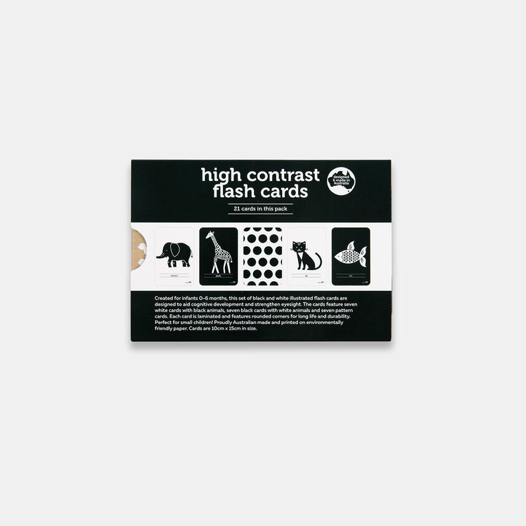 Created for infants 0-6 months, this set of black and white illustrated flash cards from Two Little Ducklings are designed to aid cognitive development and strengthen eyesight. The cards feature seven white cards with black animals, seven black cards with white animals and seven pattern cards. Each card is laminated and features rounded corners for long life and durability. Perfect for small children! Proudly Australian made and printed on environmentally friendly paper. Cards are 10cm x 15cm in size.
