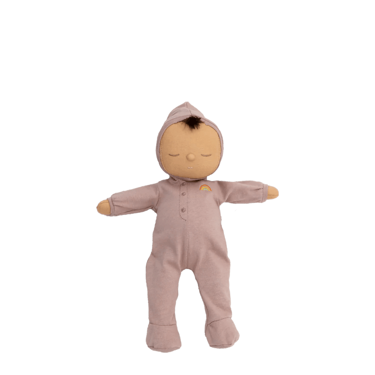 • Dozy Dinkums wear a non-removable cotton onesie with an embroidered rainbow on heart area.
