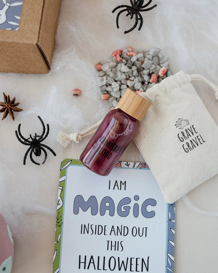 This potion play set is packed with spooky and sweet ingredients that are only available at Halloween times. Ingredients like Grave gravel and bone dust and sweet candy crush and raspberry fizzle. Will you keep your spooky and sweet ingredients separate or make a big trick or treat witches brew? It's up to you and where your imagination can take you.