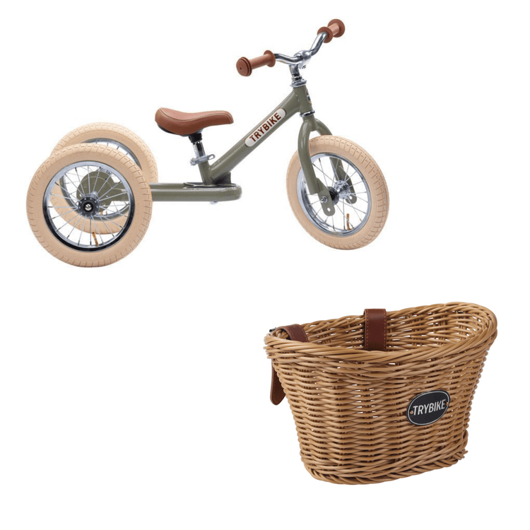 TRYBIKE | STEEL 2-IN-1 TRICYCLE & BALANCE BIKE - VINTAGE GREEN WITH HANDLEBAR BASKET
