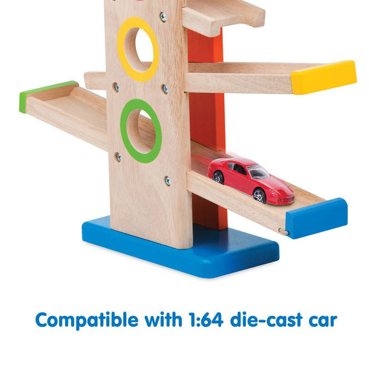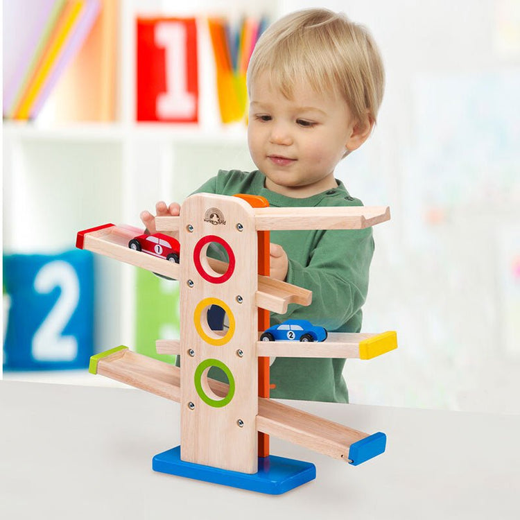 Children will enjoy watching the cars rolling down the tracks with a special gate to open or close the first level track to release or store cars. Promotes cause & effect, concentration and trial and error skills.