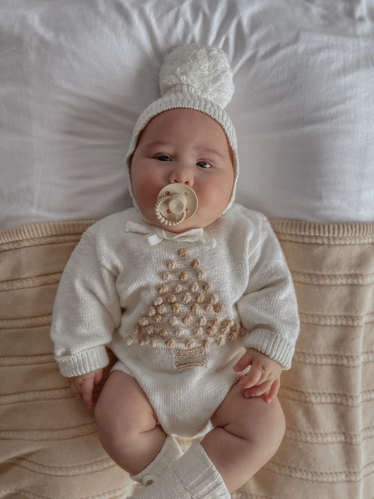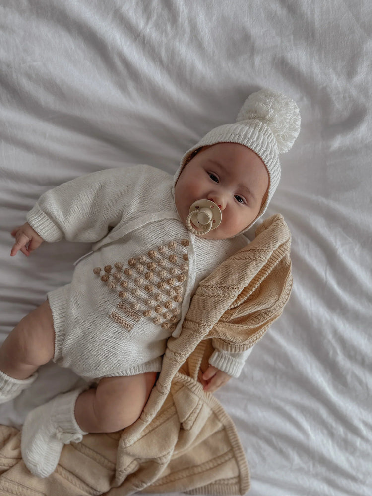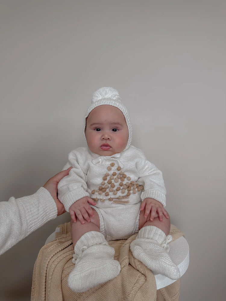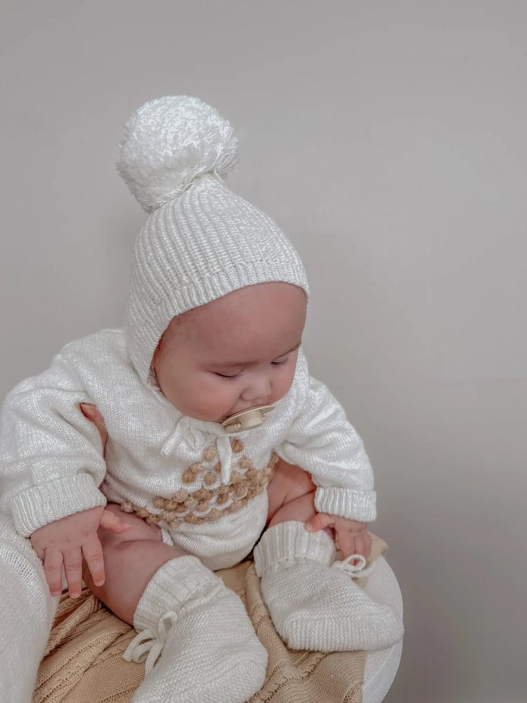Beautiful textured knit bonnet with pom pom in our Coconut colour. Match with our Coconut Collection for the perfect outfit.